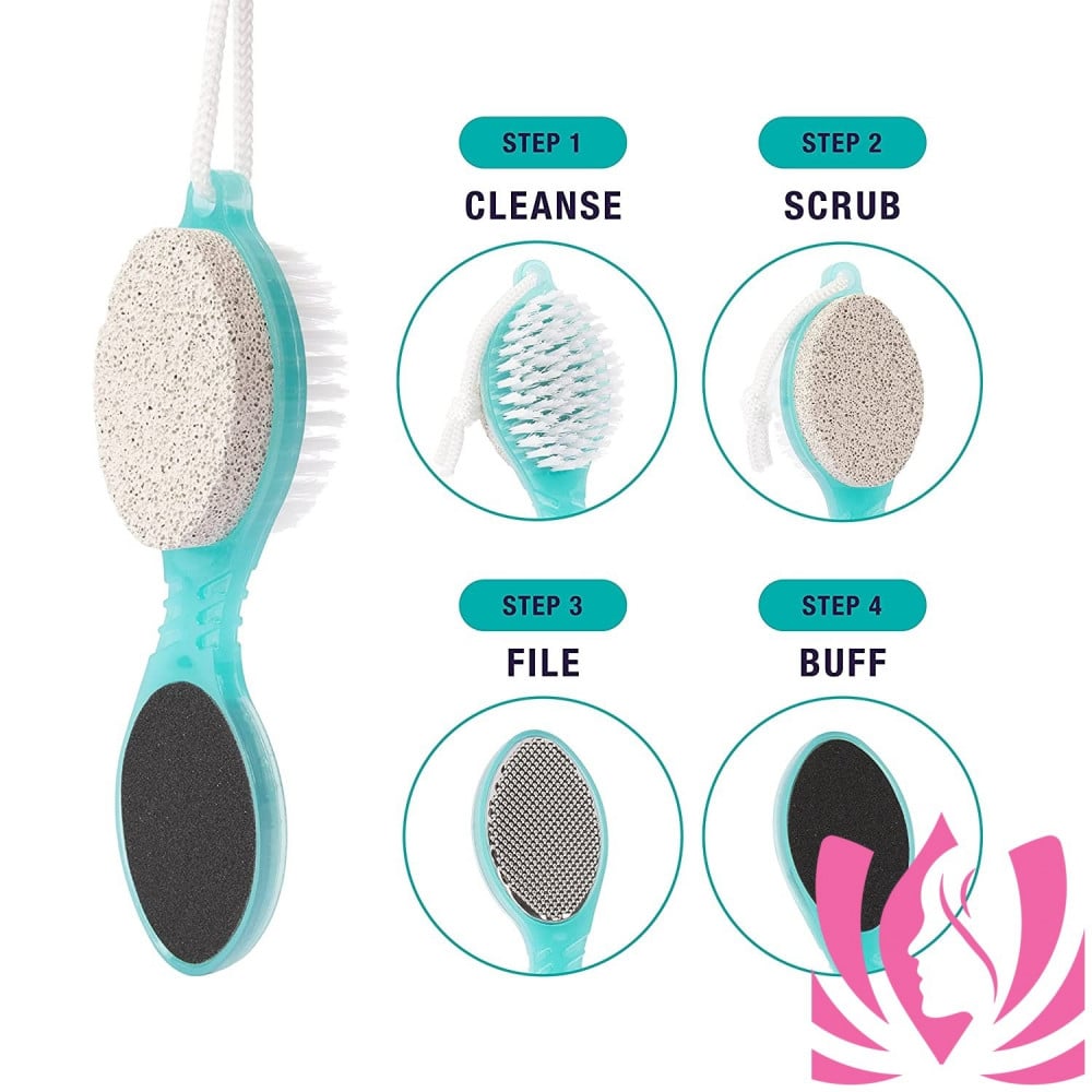 تتضمن - أداة باديكير 4 في 1 هذه تحتوي على عرموش معدنية للمساعدة في إزالة الجلد الميت بينما ينعم حجر الخفاف مسامير القدم الخشنة. تزيل فرشاة مقشر القدم الأوساخ وينعم السطح الكاشطة البشرة الخشنة.