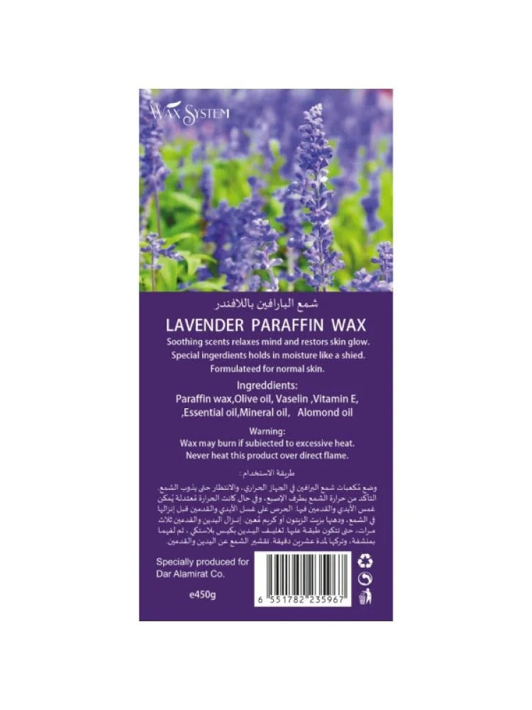 استمتعي بتجربة فاخرة للعناية بالبشرة مع شمع البارافين باللافندر من WAX SYSTEM، الذي يوفر لك المزيج المثالي من الترطيب العميق والاسترخاء العقلي بفضل رائحته المهدئة.
